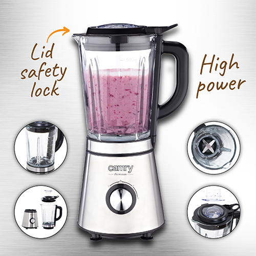 CR4083 table blender with 2200W power for efficient and quick grinding and mixing of food products, Available 2 speed levels, access blending with different intensity, Additionally, pulse function, The 1,5-liter jug is made of solid, thick glass, Thanks to this, you can be sure that the blender will serve for many years, You can use 2 speed levels and the Pulse function, It temporarily increases the speed of rotation of the blade, which makes it easier to blend harder vegetables,