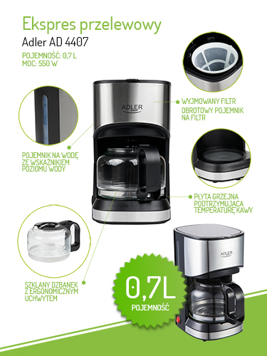 An efficient drip coffee maker rated at 550 W, The glass jug with a ergonomic handle allows to make 0,7 L of coffee at one go, A keep-warm plate allows to keep stable temperature of the glass jug, so that coffee tasty flavours are preserved longer, The drip coffee maker is also equipped with a water tank with water level window, that helps you prepare exactly as much coffee as you wish, In order to make the coffee maker more comfortable in operating, it is equipped with an anti-drip valve, For more safety it is equipped with an overheat protection, Another advantage is its removable permanent filter that can be removed from the appliance and cleaned quickly and easily,