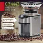 Electric coffee grinder with conical burrs with 200 W power for aromatic, freshly ground coffee, The device is characterized by a compact size and modern design, It works quietly, with a lot of time and is protected against switching on without the lid side, The CR 4443 grinder uses a burr inserted in a conical structure for grinding, These are the elements that crush the coffee beans during operation, The biggest advantage of this type of grinder is the automation of the grinding process and the stainless steel housing, Coffee lovers such as espresso, cappuccino or latte will also appreciate the option to purchase the grinding of beans, Each of them has a preference for what kind of coffee tastes best for us, our grinder allows you to choose one of the 16 grinding settings, Whats more, a full container guarantees the preparation of 12 cups of coffee,