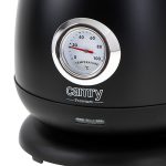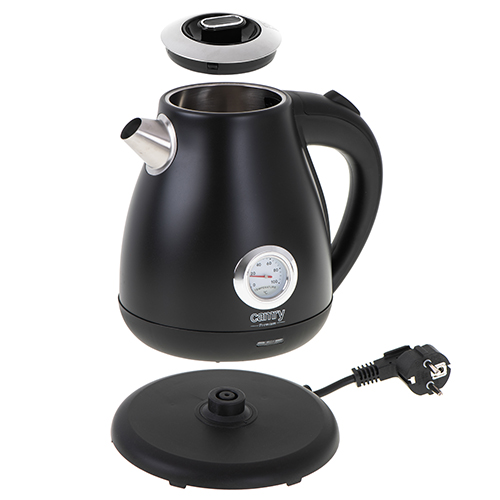 Classic, 1,7-liter electric kettle with a thermometer, useful in every kitchen, Its safety is ensured by a lock that prevents turning on an empty kettle, and automatic shutdown after boiling water, The functionality is increased by a stable base and a clear water level indicator, It has a maximum power of 2200W and is made of stainless steel, which makes it a master solution when it comes to quickly boiling water, An analogue water temperature indicator and a slim shape are features that will complement the interior of any room decorated in any style,