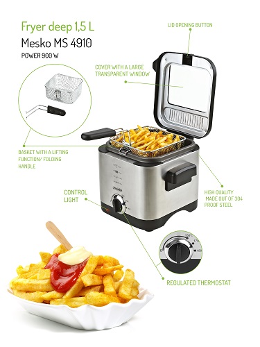 When you are throwing a big party or planning a dinner for a bigger number of people you can include serving home-made frites, onion rings, chicken nuggets or coated vegetables, The MS 4910 deep fryer that has a capacity of 1,5l is perfect when preparing such deep-fried meals or additives for a number of people, Thanks to MS 4910 deep fryer you can fry your frites, onion rings, vegetables or meat easily at home: the device is equipped with a filter in the lid and a lid opening button, You will not burn the food thanks to the regulated thermostat, You can drip the surplus of fat thanks to the basked with lifting function that has a folding handle,