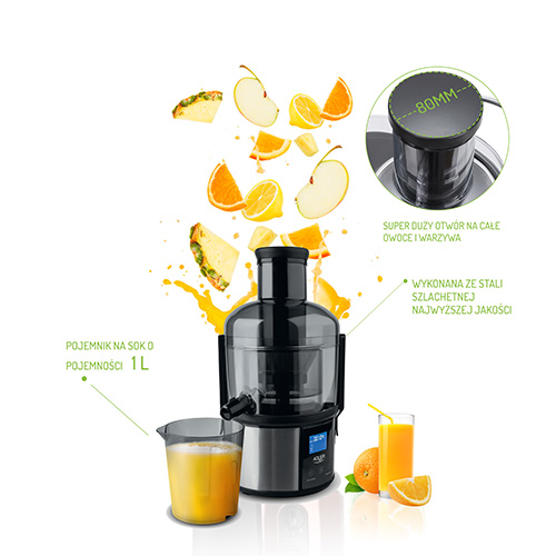 A sweet juice or a sour cocktail? The AD 4124 juice extractor can serve to prepare both of these beverages, No matter whether youd use apples, carrots, celery or peaches, you will always achieve a tasty and healthy beverage, The AD 4124 juice extractor allows you to regulate the rotation speed (number of rotations per one minute), To do that you can choose from five speed settings and this way decide how your fruits and vegetables will be prepared, Included in the set you will find a container of a capacity of 1l and a brush for convenient cleaning of the device,