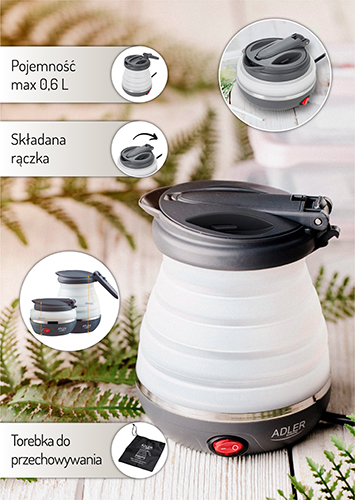 It is difficult to imagine breakfast without the favourite aromatic tea or coffee that you need to start the day with energy, On holidays it is particularly difficult to function without hot water, among other things, to prepare the characteristic of all vacations: instant meals! The portable kettle ADLER AD 1279 is an ideal product for people who spend a lot of time on a plot or on trips both for holidays and for business purposes, Thanks to modern solutions, the kettle will work both on the campsite and in the hotel room, It is important particularly when travelling, it will not take up much space in your luggage! It has been equipped with a folding handle to occupy even less space and a material storage pouch,