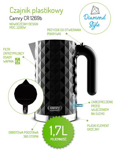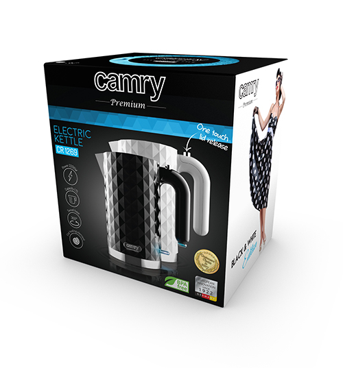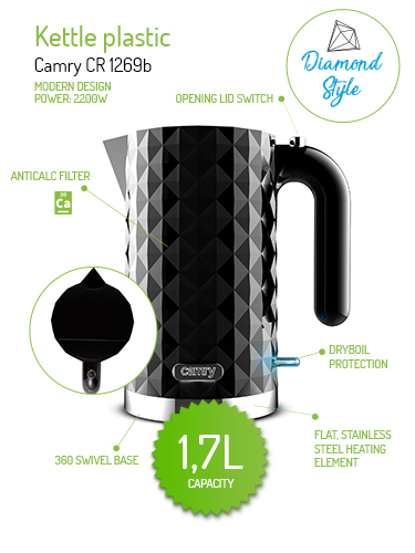 Electric Kettle Camry CR 1269 of max 2200W powersets new design trends among the electrical devices, This is a very exclusive series of kettles chosen generally by people who appreciate attractive appearance, The kettle is so much more than a simple home device – it works also as a unique decoration of your kitchen, A perfect element of modern interiors as well as of representative rooms such as an office, the registrars office or conference room, The capacity of 1,7l gives you the opportunity to boil water for several people at the same time,