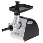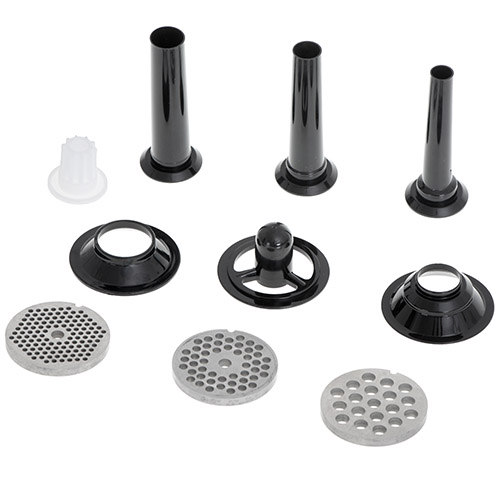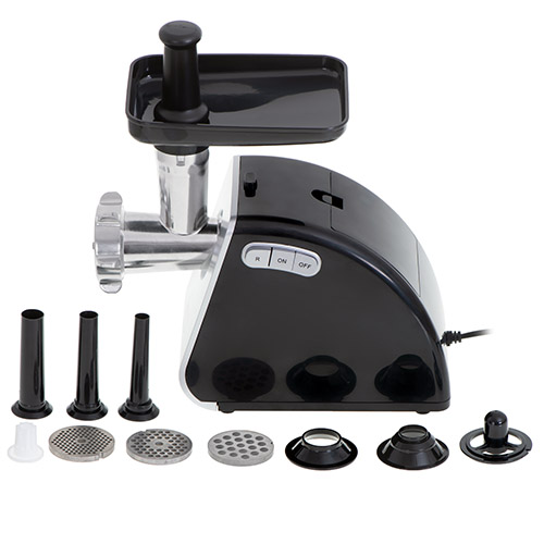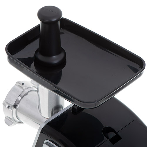 A reliable device for those who want to prepare their own sausages and minced meat, Larger than the standard grinding chamber number 8, it is possible to grind 2 kg of meat in a minute, Meat grinder equipped with 3 replaceable stainless steel sieves with hole diameters: 3mm, 5mm, 7mm, The set also includes a sausage attachment, a Kebbe attachment and a pusher, The unit is made of durable materials, easy to disassemble and clean, The user can choose from 2 speeds (forward and reverse – backward), The machine has a power of 500 W, with peak power up to 1600 W, The device has a built-in storage for accessories to prevent them from being lost, The machine is equipped with a two-sided cross-shaped knife, the life of which is higher, and the assembly is easier because both sides are cutting, In this way, there is no risk of reverse assembly of the knife, consequently the necessity to disassemble whole grinding chamber in order to put it on the cutting side like the case of one-sided knives,
