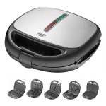 The multifunctional AD3040 baking device replaces up to 5 devices, Due to high power of 1200W, the device allows not only to toast sandwiches, but also double-sided grilling of food, baking crispy waffles and “nuts” type cookies, The device is equipped with 5 types of interchangeable plates: to sandwiches made of toast bread (plate with triangles for thinner sandwiches), to traditional bread sandwiches (plate with square recesses for thicker sandwiches), for grilling (plate with longitudinal grooves), to waffles (checkered plate), for “nuts” type cookies (plate with grooves for dough balls),