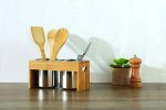 Set van 2 roestvrijstalen bestekbakken met bamboe steun en handgrepen