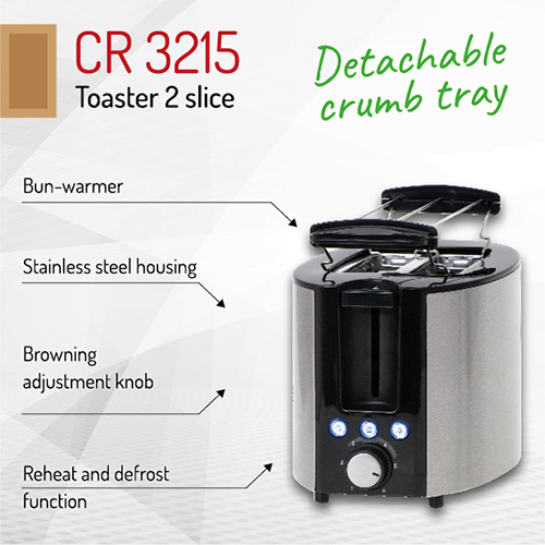 An efficient 1000W toaster in which two toasts at a time can be prepared, The browning adjustment knob allows to prepare toasts the way one likes the best, Thanks to that they are exactly as crispy as they should be, The crumb tray helps in keeping the device, as well as the place where one prepares a meal, clean, When the toaster is on its housing remains cool – this is one of the factors that increase the safety of operating the device, One can stop the browning process using the CANCEL button,